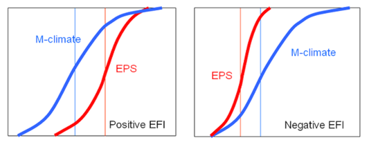 If the forecast probability distribution agrees with the M-climate distribution then EFI = 0. If the probability distribution (mean, spread and asymmetry) does not agree with the climate probability distribution, the EFI takes non-zero values. In the special case where all the members forecast values above the absolute maximum in the M-climate, the EFI = +1; if they all forecast values below the absolute minimum in the M-climate the EFI = -1 (see Figure 1).