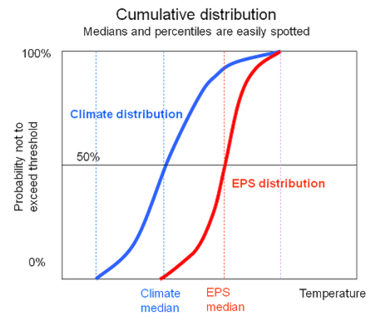 Figure 2: A schematic explanation of the principle behind the Extreme Forecast Index, measured by the area between the cumulative distribution functions (CDFs) of the M-Climate and the ensemble members. The CDF shows the probability (y-axis) against the exceedance threshold value (x-axis). The EFI is, in this case, positive (red line to the right of the blue), indicating higher than normal probabilities of warm anomalies.